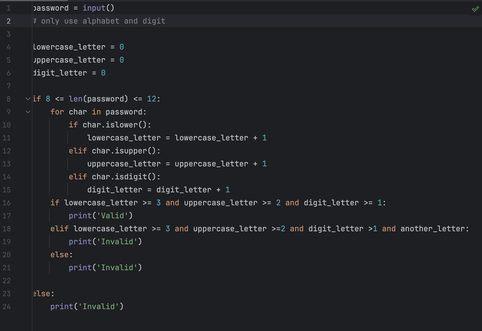 16. 만약 lowercase_letter가 3보다 크거나 같고(>= 3), uppercase_letter가 2보다 크거나 같고(>= 2), digit_letter가 1보다 크거나 같다(>= 1)면,