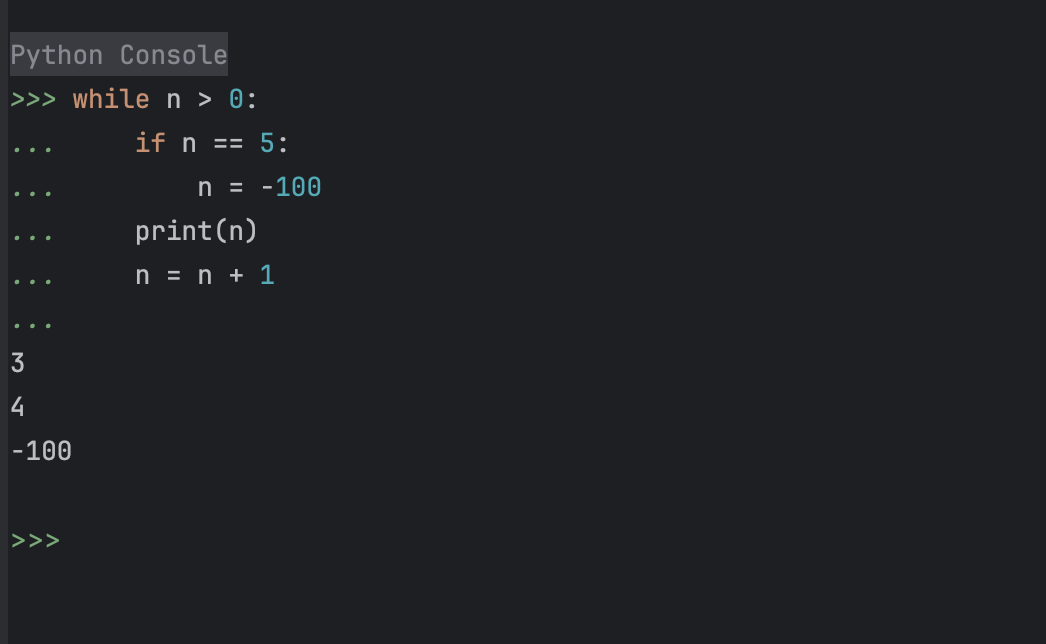 여기에서는 처음 n = 3으로 할당해 주었다. 그리고 n이 0보다큰 동안 만약 n이 5을 참조한다면 n은 -100이 되는 것까지는 알겠는데, 왜 3, 4, -100에서 끝났지?...... 라고 생각하고 있었는데, 아~~~~~~~ 깨달았다. n은 0보다 커야 하는데, n이 -100이 되는 순간 0보다 작아져서 반복이 끝났구나~ 복습이 이래서 중요하다!!! 왜 이런 생각을 못했을까???