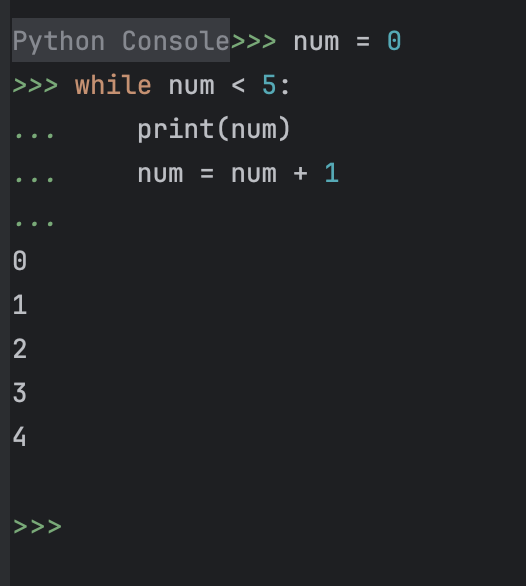 num을 0으로 할당하고 num이 5보다 작은 동안 num을 출력하는데, num은 1씩 증가한다.